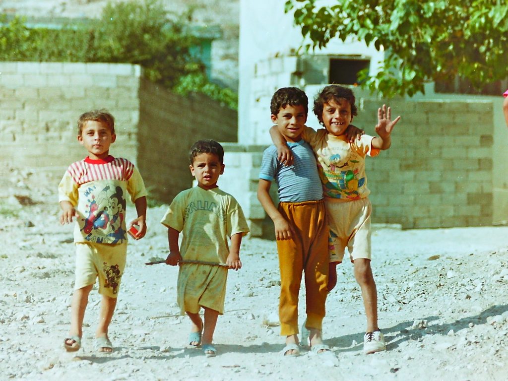 La foto ferma da sinistra JABER (il consolatore) di 5 anni e suo fratello NA’IM (colui che è buono, benefico) di 3; gli altri due bambini con cui giocano sono SAMIR (il compagno divertente) di 7 e ABDEL ‘ADIL (servo del giusto) di 8 anni.