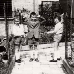 … No! Non la ricordavo proprio. Io con la pistola, Vanes Mimmi arrestato e Gledis con il fucile… In un momento tutte le cose dolci dell’infanzia mi sono tornate in mente… Sull’anno di questo scatto lui è sicuro: era il 1967. “Doveva essere una giornata di festa, eravamo elegantissimi…” Abbiamo deciso che fosse Pasqua perchè così sono passati esattamente 50 anni e questa foto è un modo per festeggiare questi giorni un po’ più speciale.