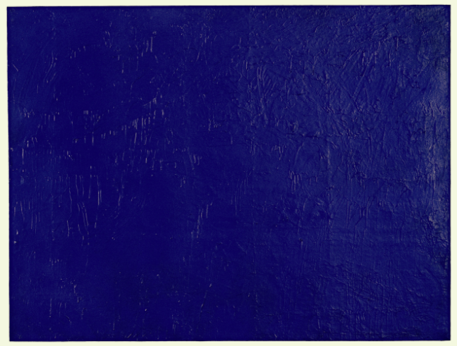 “Questo blu su blu, irradia una vibrazione colorata che raggiunge un’ampiezza massima. E’ come se questo colore cominciasse ad animarsi. La superficie appare soffice. Il pigmento di colore prende la consistenza di un panno di cotone grezzo. E’ come se la consistenza del colore modelli strani paesaggi e un orizzonte che sembra galleggiare. Lo sguardo viene accompagnato verso il basso in una profondità che non appartiene allo spazio tridimensionale della vita quotidiana, ma ad una dimensione in più che l’artista invita a scandagliare: la profondità del colore. E’ come se questo blu richiamasse non solo lo sguardo: “è la mente che vede con gli occhi. Insomma, nei suoi dipinti, Yves Klein si concentra su degli aspetti spirituali oltre che quello fisici. Per lui la pittura è meditazione e sfugge alla quotidianità, per aprirsi alla meditazione“.