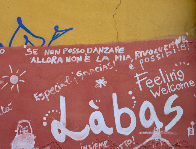 L’anno scorso, in una mezza giornata bolognese, sono andato a visitare il centro sociale Labas in via Orfeo. Ne sapevo poco o niente, come del resto ne so poco o niente ora. Mi interessava vedere la street art che c’è lì attorno e con una certa circospezione sono entrato con la macchina fotografica. Rispetto a certi posti romani che andavo a vedere in quel periodo (sempre per i graffiti) mi è sembrato di entrare in un salotto. Ma Bologna è sempre stata più attenta alla forma e anche i centri sociali devono rispettare questa tradizione.