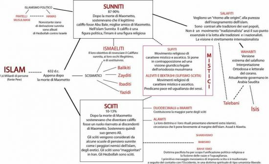 Le tendenze definite dallo schema sono confermate in uno dei pezzi più letti nel sito di Internazionale, che a sua volta fa un riassunto efficace delle differenze che ci sono tra i musulmani, partendo da un’altra mappa dell’Islam.