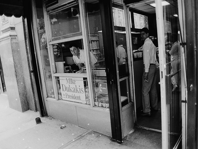 (Apro una parentesi: 10 anni dopo quella dichiarazione che fa onore a Dukakis, si trovò a sfidare George Bush padre nella corsa alla Casa Bianca e perse in modo molto netto. Ho ritrovato una foto dove si vede uno dei cartelli della sua campagna elettorale, nella vetrina di uno street food a New York nel 1988)