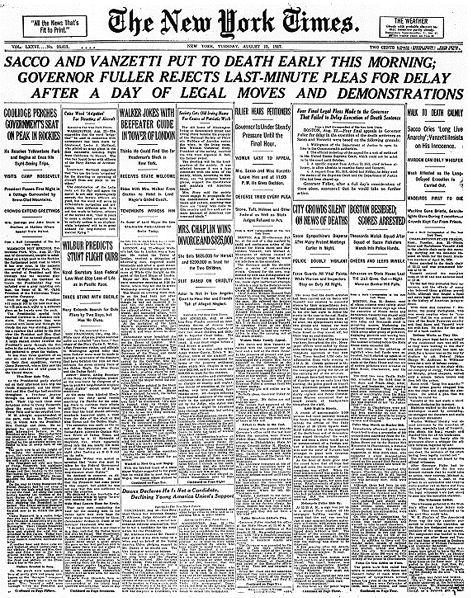 Scrivo oggi di loro perchè è la ricorrenza del 90esimo anniversario dell’esecuzione della condanna a morte di Nicola Sacco e Bartolomeo Vanzetti. I due furono riconosciuti colpevoli di omicidio di un ragioniere e di una guardia di un calzaturificio di South Braintree, una ventina di miglia a Sud di Boston, in Massachusetts.