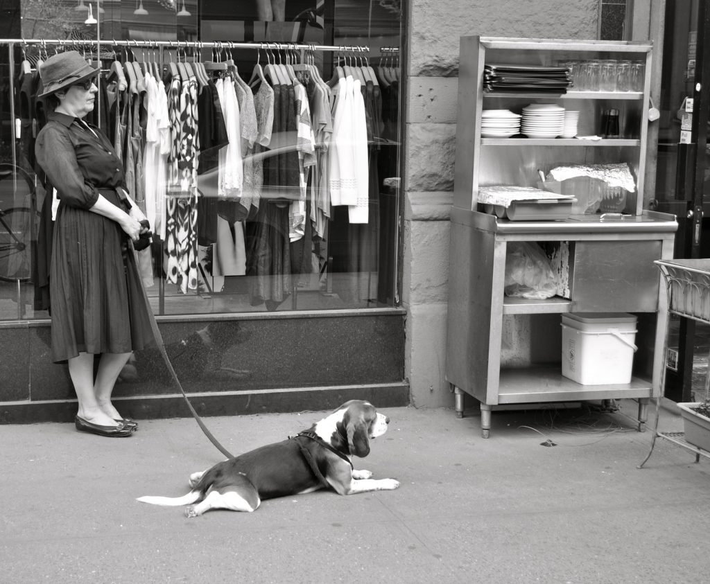 La donna sola con lo sguardo da Keith Richards e l’animale solo sono una coppia perfetta. Uno più uno fa due. Nella scelta di guardare entrambi nella stessa direzione sembra esserci la somma di due scelte individuali. Io guardo verso sinistra, sembra dire lei. Io guardo verso sinistra, sembra pensare lui. Il giudizio che danno entrambi della società che sta alla loro sinistra, che probabilmente sta riempiendo e liberando i tavoli all’aperto di un ristorante, è la somma di due giudizi individuali. Fossero una parola, sarebbero un misto di fierezza e libertà. In cui l’occhiale scuro e il guinzaglio sono l’unica concessione alla società di oggi. Gli unici orpelli a cui lei e lui cedono per dimostrare che, in fondo, popolano lo stesso mondo delle persone che guardano. In attesa di prendere il loro posto, foss’anche per qualche minuto, in un tavolino all’aperto.