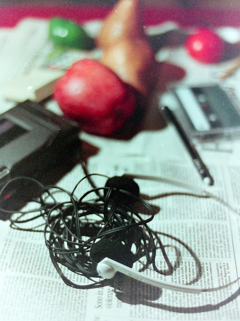 Quando ho visto questa foto mi è scorso davanti un pezzo importante della mia vita. Ha acceso la lampadina su un periodo molto intenso, bello e formativo a cavallo degli anni Ottanta. La stessa sfocatura della frutta nello sfondo che man mano acquista nitidezza sulle cuffie sta ad indicare realisticamente quello che è stato un percorso personale che mi ha visto abbandonare pian piano l’impegno politico diretto per passare ad un lavoro, quello giornalistico, che ha riempito la mia vita nei decenni successivi.