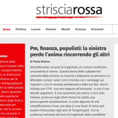 Mi piacciono invece le 4A scelte come barra di navigazione: “approfondimento, accuratezza, affidabilità, autonomia”. Che Pietro Spataro, animatore di questa iniziativa spiega così: “Approfondimento, perché crediamo che oggi, anche e soprattutto nel mondo di Internet, ci sia bisogno di un’informazione che scavi dentro le notizie, che sappia dire di più e possibilmente meglio. Accuratezza, perché vogliamo essere sicuri di quello che scriviamo e quindi non scriveremo mai articoli con i “forse”, i “si dice”, i “sembra che”. Affidabilità, perché vogliamo cercare di creare un circuito di fiducia tra noi e i nostri lettori affinché StrisciaRossa diventi una comunità di persone che ragionano con la propria testa e non con la propria pancia. Autonomia, perché non saremo il giornale di nessuno, di nessun partito e di nessun leader. Vogliamo raccontare i fatti con le nostre idee senza rendere conto se non alla nostra professionalità e ai nostri lettori”.