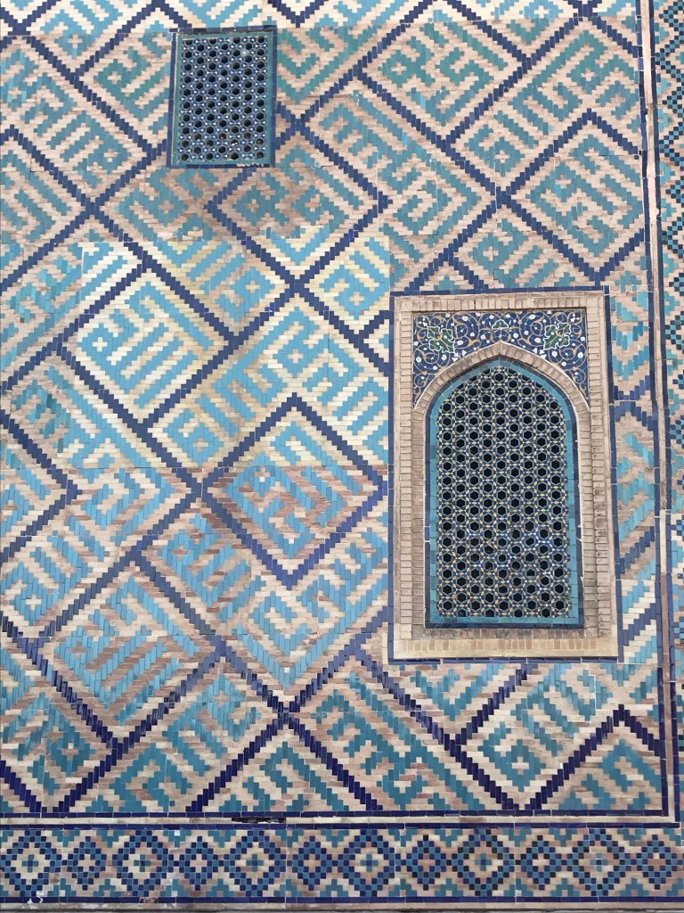 L’impatto è leggiadro e austero allo stesso tempo. Le facciate sono interrotte dalle filigrane infinitamente complicate di colonne ed archi intagliati, decorati e smaltati. Il pavimento di mattonelle è un mosaico di turchese azzurro, oro, rosa e verde – un fuoco d’artificio congelato per l’eternità.