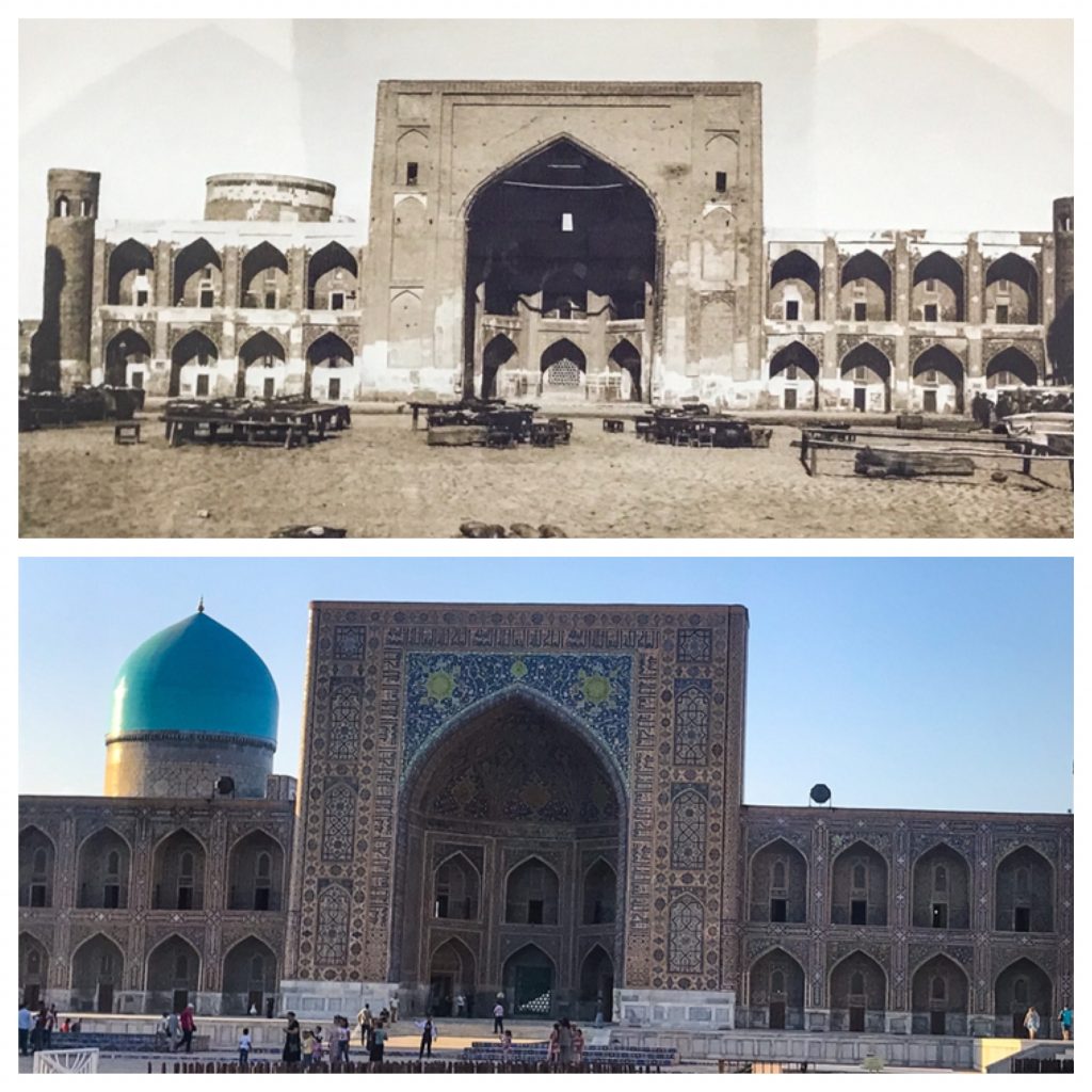 Il restauro di Samarcanda, per quanto possa essere stato realizzato con criteri “sovietici” appare davvero spettacolare. Il visitatore magari è informato, sa che quello che vede non è esattamente quello che c’era prima. Ma l’effetto non è dysneiano, almeno per me, tutt’altro. La differenza con la maggiore sobrietà di Bukara c’è, come del resto la sorpresa. Poi forse dipende anche in quale delle due città si arriva prima: arrivando dal Tagikistan, Samarcanda è davvero una meraviglia.